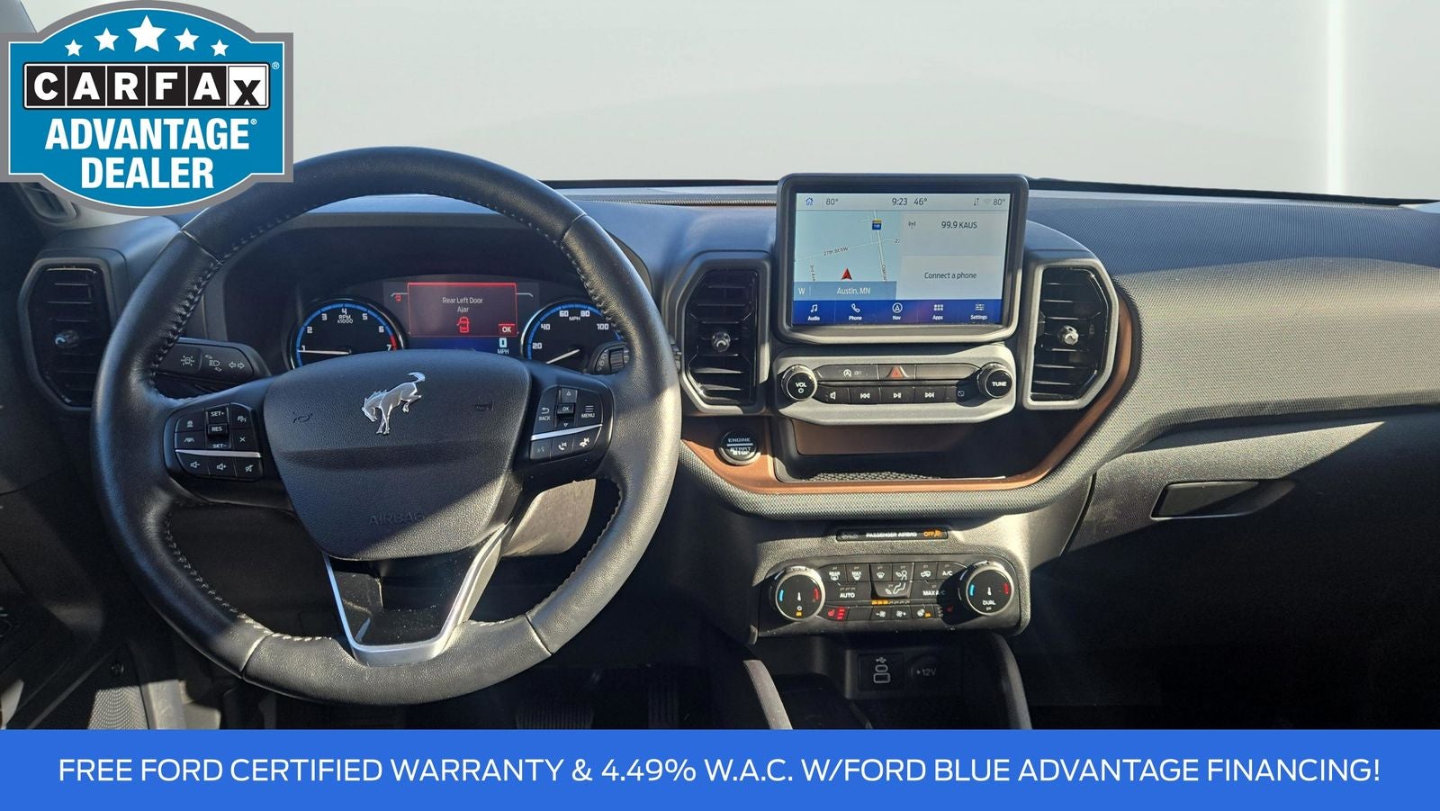 **LOCAL TRADE ALERT!!** 2023 Ford Bronco Sport Outer Banks 1.5L EcoBoost 4WD **FORD GOLD CERTIFIED, 7 YEAR/100,000 MILE WARRANTY**, **FULL FACTORY WARRANTY**, **CLEAN CARFAX 1 OWNER**, **NO ACCIDENTS/CLEAN VEHICLE HISTORY**, **HEATED FRONT SEATS**, **HEATED STEERING WHEEL**, **REAR VIEW CAMERA**, **REMOTE START**, **PREMIUM SOUND SYSTEM**, **4 WHEEL DRIVE**, **FRESH OIL & FILTER CHANGE,TIRE ROTATION,NEW AIR/CABIN FILTER AND NEW WIPERS BLADES**, **FORD CO-PILOT360 ASSIST+**, Auto High-beam Headlights, Equipment Group 300A, Evasive Steering Assist, Ford Co-Pilot360 Assist+, HD Radio, Heated door mirrors, Heated front seats, Heated steering wheel, Intelligent Adaptive Cruise Control w/Stop & Go, Leather Trimmed Heated Sport Contour Bucket Seats, Power door mirrors, Power driver seat, Rear Parking Sensors, Steering wheel mounted audio controls, SYNC 3/Apple CarPlay/Android Auto, Tech Package, Universal Garage Door Opener (UGDO), Voice-Activated Touchscreen Navigation System, Wheels: 18 Ebony Black-Painted Aluminum, Wireless Charging Pad.