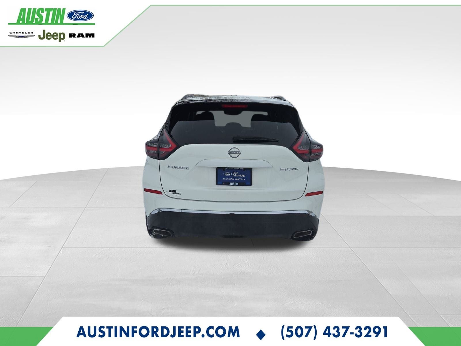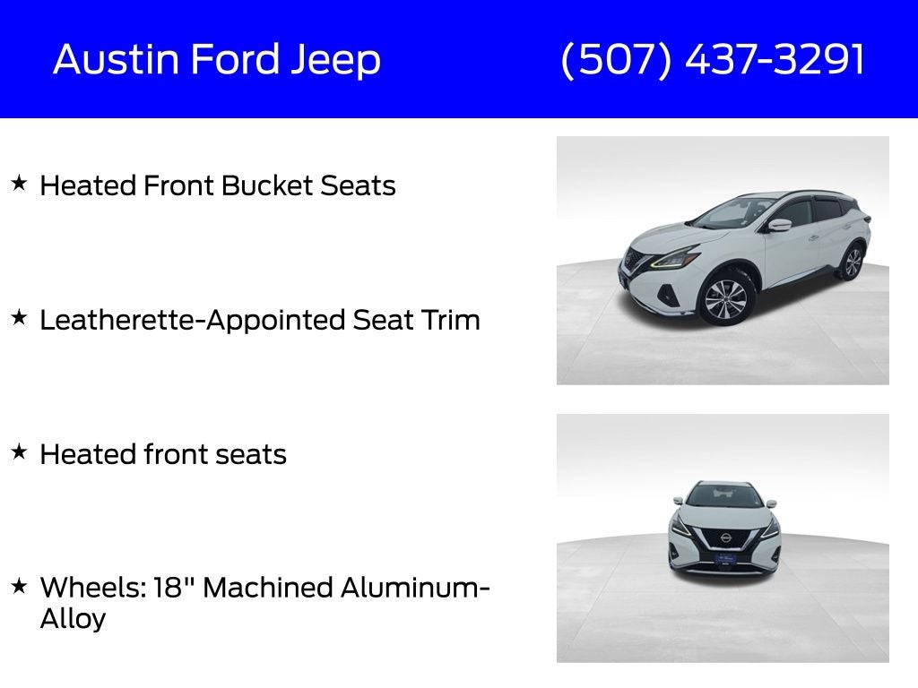 **LOCAL TRADE, In my opinion, the Murano is the smoothest riding SUV of this size. I've driven just about every brand, take my word for it. Better yet come drive it and find out for yourself and enjoy the confidence of having Ford's FREE BLUE ADVANTAGE CERTIFIED WARRANTY!!** 2023 Nissan Murano SV 3.5L V6 DOHC 24V AWD **FORD BLUE CERTIFIED, 3 MONTH/4,000 MILE WARRANTY**, **NEW TIRES**, **CARFAX CERTIFIED**, **NO ACCIDENTS/CLEAN VEHICLE HISTORY**, **HEATED LEATHER SEATS**, *FULL SAFETY INSPECTION*, **HEATED FRONT SEATS**, **REAR VIEW CAMERA**, **REMOTE START**, **BLIND SPOT MONITORING**, **ALL WHEEL DRIVE**, **FRESH OIL & FILTER CHANGE,TIRE ROTATION,NEW AIR/CABIN FILTER AND NEW WIPERS BLADES**, CVT with Xtronic, AWD, Heated door mirrors, Heated Front Bucket Seats, Heated front seats, Leatherette-Appointed Seat Trim, Security system, Steering wheel mounted audio controls, Wheels: 18 Machined Aluminum-Alloy.